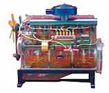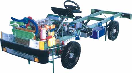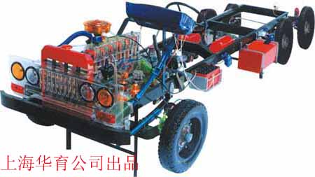本品選用透明有機玻璃制作,內(nèi)中部件均以硬質(zhì)塑料料加工,用 螺絲固定在金屬高溫烘漆而成的車架上。各總成部分都以壓模成形加 工,代替過去膠粘合的方法,使產(chǎn)品在強度上有很大提高。發(fā)動機總成用電機驅(qū)動,在油門處設(shè)有調(diào)速裝置,能演示發(fā)動機轉(zhuǎn)速高低。離合器分離明顯,操縱靈活,離合器外殼整體壓模而成,變速箱和各檔齒輪用各種顏色表示,換檔靈活,手制動美觀。后橋外形壓模而成,內(nèi)中主減速、差速轉(zhuǎn)動自如,輪轂剎蹄壓模成型,剎蹄可調(diào)節(jié),前橋輪鼓可調(diào)整,轉(zhuǎn)向裝置以及電瓶、油箱、水箱,制動管路分布清楚一目了然。電路采用對插件前后分布,燈架、風(fēng)窗、儀表板、后燈架用透明有機玻璃壓模成整體美觀逼真。