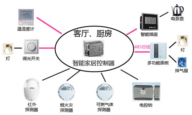 智能電子產(chǎn)品系統(tǒng)網(wǎng)絡(luò)示意圖 1. 家庭控制中心說明: 客廳廚房控制中心 客廳廚房控制中心包含智能家居控制器、電控鎖、多功能面板、節(jié)能燈、排氣扇、智能調(diào)光開關(guān)、智能光強(qiáng)及溫濕度計、智能插座、電茶壺、可燃?xì)怏w探測器、煙火災(zāi)探測器及紅外探測器。 電控鎖通過智能家居控制器控制門的開啟;多功能面板控制客廳、廚房燈的開關(guān);智能調(diào)光開關(guān)調(diào)節(jié)LED燈的亮度、也可通過485總線與智能家居控制器通訊,通過情景模式智能調(diào)節(jié)LED燈的亮度;智能光強(qiáng)及溫濕度計顯示采集客廳溫濕度及光照度;智能插座控制和采集電茶壺的電源和電量信息,可合理分配用電負(fù)荷;可燃?xì)怏w探測器、煙火災(zāi)探測器及紅外探測器用于組件家居系統(tǒng)的安防系統(tǒng)。 多功能面板、智能調(diào)光開關(guān)、智能光強(qiáng)及溫濕度計、智能插座通過485總線與智能家居控制器通訊,可燃?xì)怏w探測器、煙火災(zāi)探測器、紅外探測器及電控鎖通過I\O口與智能家居控制器通訊。