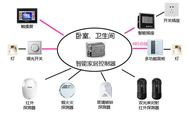 智能電子產(chǎn)品系統(tǒng)客廳廚房安裝配置圖 臥室衛(wèi)生間控制中心 臥室衛(wèi)生間控制中心包含智能家居控制器、觸摸屏、多功能面板、智能調(diào)光開關(guān)、智能插座、煙火災(zāi)探測器、紅外探測器、玻璃破碎探測器、雙光束對射紅外探測器。 觸摸屏通過485與智能家居控制器通訊,可實(shí)現(xiàn)遙控、遙信、遙調(diào)及情景模式的設(shè)定;智能調(diào)光開關(guān)調(diào)節(jié)白熾燈的亮度、也可通過485總線與智能家居控制器通訊,通過情景模式智能調(diào)節(jié)白熾燈的亮度;多功能面板控制臥室、衛(wèi)生間燈的開合;智能插座控制和采集相關(guān)用電設(shè)備電源和電量信息,可合理分配用電負(fù)荷;煙火災(zāi)探測器、紅外探測器、玻璃破碎探測器、雙光束對射紅外探測器用于組件家居系統(tǒng)的安防系統(tǒng)。 觸摸屏、多功能面板、智能調(diào)光開關(guān)、智能插座通過485總線與智能家居控制器通訊,煙火災(zāi)探測器、紅外探測器、玻璃破碎探測器及雙光束對射紅外探測器通過I\O口與智能家居控制器通訊。